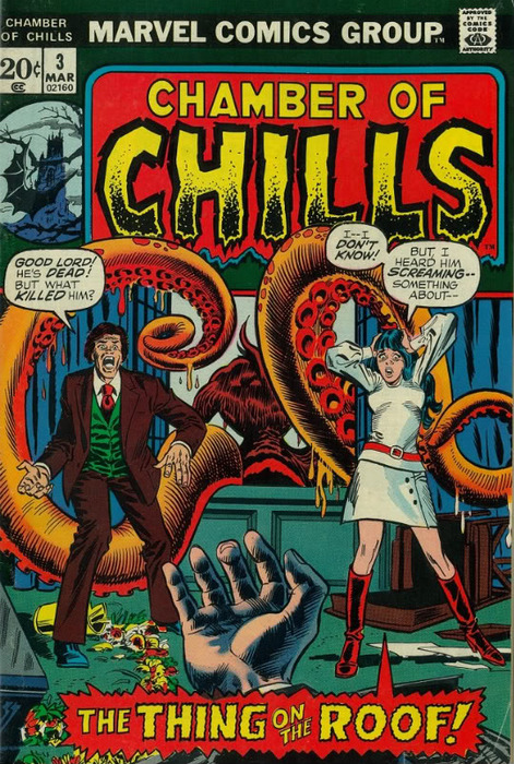 Original post here Image contains the text “Marvel Comics Group: Chamber of Chills. The thing on the roof.” Two character dialog lines: “Good Lord, he’s dead! But what killed him?” and “I…I don’t know. But I heard him screaming about…” Sourced to greatgrottu via innsmouthharborseafoodcompany-d.