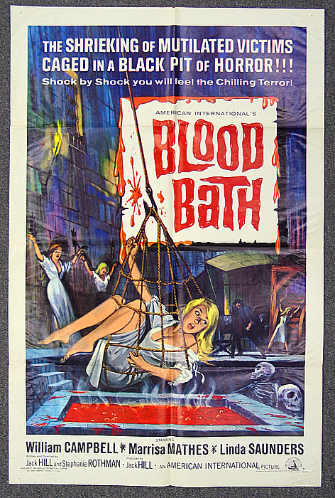 Original post here. Image contains the text “The shrieking of mutilated victims caged in a black pit of horror!!! Shock by Shock you will feel the chilling terror! Amerian International’s Blood Bath. William Campbell; Marrisa Mathes; Linda Saunders; Jack Hill; and Stephanie Rothman.” Sourced to roncmerchant via gotham-city-hardcore.