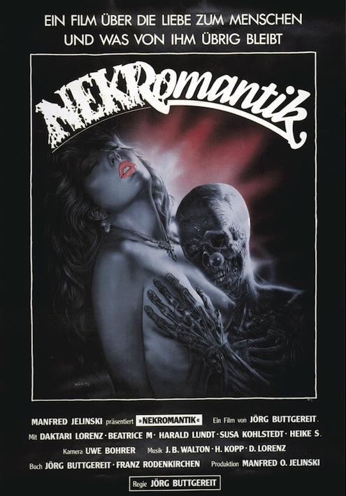 Original post here. Image contains the text “Ein Film über die Liebe zum Menschen und was von ihm übrig bleibt. Nekromantic. Manfred Jelinksi präsentiert »Necromantik« Ein Film von Jörg Buttgereit. Mit Daktari Lorenz, Beatrice M, Harald Lundt, Susa Kohlstedt, Heike S. Kamera Uwe Bohrer. Muzik J.B. Walton, H. Kopp, D. Lrenz. Buch Jörg Buttgereit, Franz Rodenkirchen. Produktion Manfred O. Jelinski. Regie Jörg Buttgereit.” Original text: