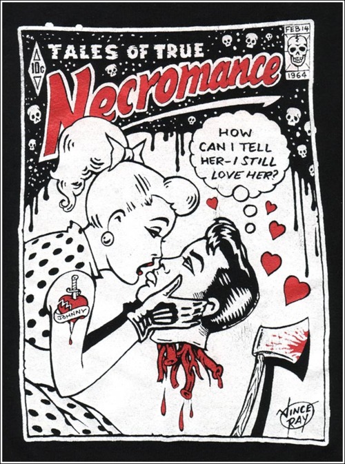 Original post here. Image contains the text “Tales of True Necromance,” a thought-balloon “How can I tell her I still love her?” and a signature for “Vince Ray.” Sourced to lintoxicated via ghastlydelights.
