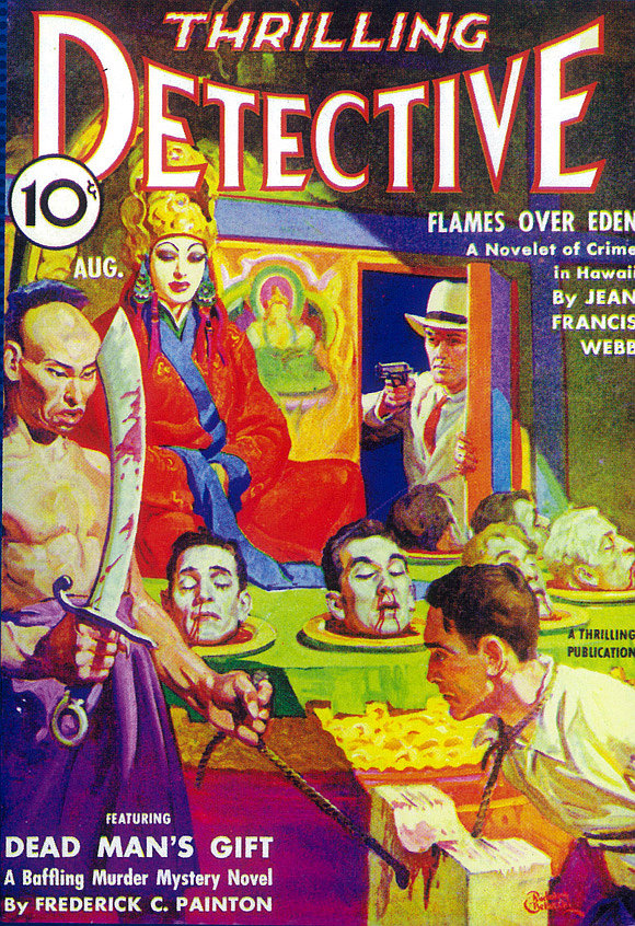 Original post here. Image contains the text “Thrilling Detective. 10¢. Flames over Edent, A Novelet of Crime in Hawaii by Jean Francis Webb. Featuring Dead Man’s Gift, A baffling Murder Mystery Novel by Frederick C. Painton.” Sourced via greatgrottu. Original text: