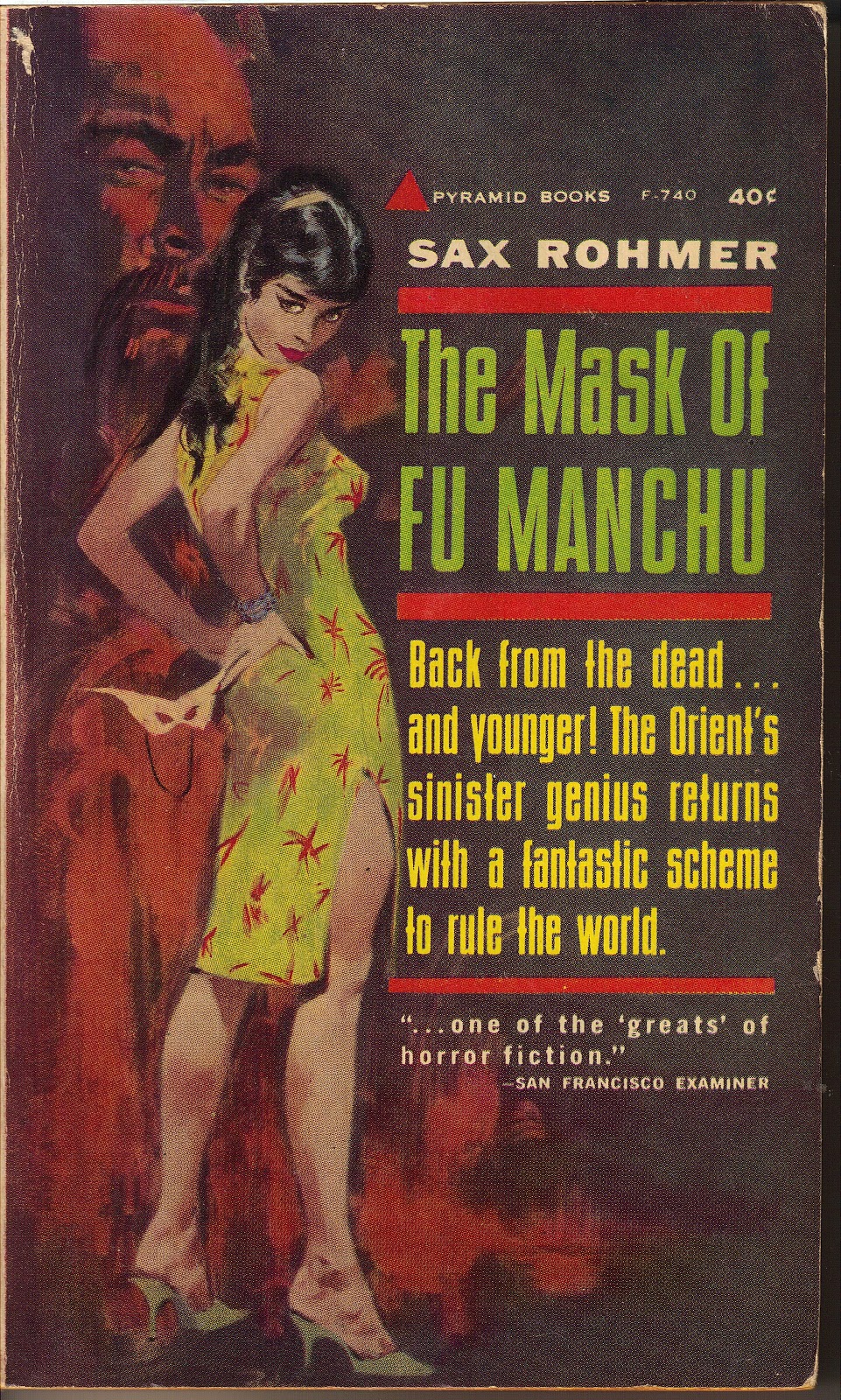Image contains the text “Sax Rohmer. The Mask of Fu Manchu. Back from the dead…and younger! The Orient’s sinister genius returns with a fantastic scheme to rule the world. ‘…one of the “greats” of horror fiction.’ –San Francisco Chronicle.”