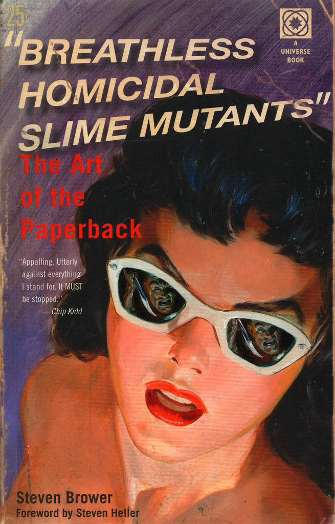 Original post here. Image contains the text “Breathless Homicidal Slime Mutants. The Art of the Paperback. ‘Appalling. Utterly against everything I stand for. It MUST be stopped.’ –Chip Kidd. Steven Brower. Forward by Steven Heller.” Original text: