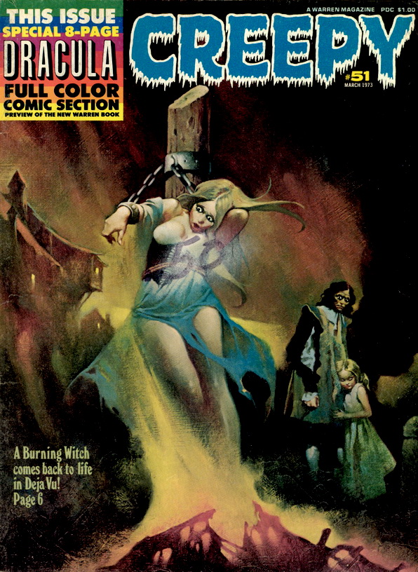 Original post here. Image contains the text “Creepy. This issue special 8-page Dracula full-color comic section (preview of the new Warren book). A Burning Witch comes back to life in Deja-Vu, Page 6.” Sourced via greatgrottu. Original text: