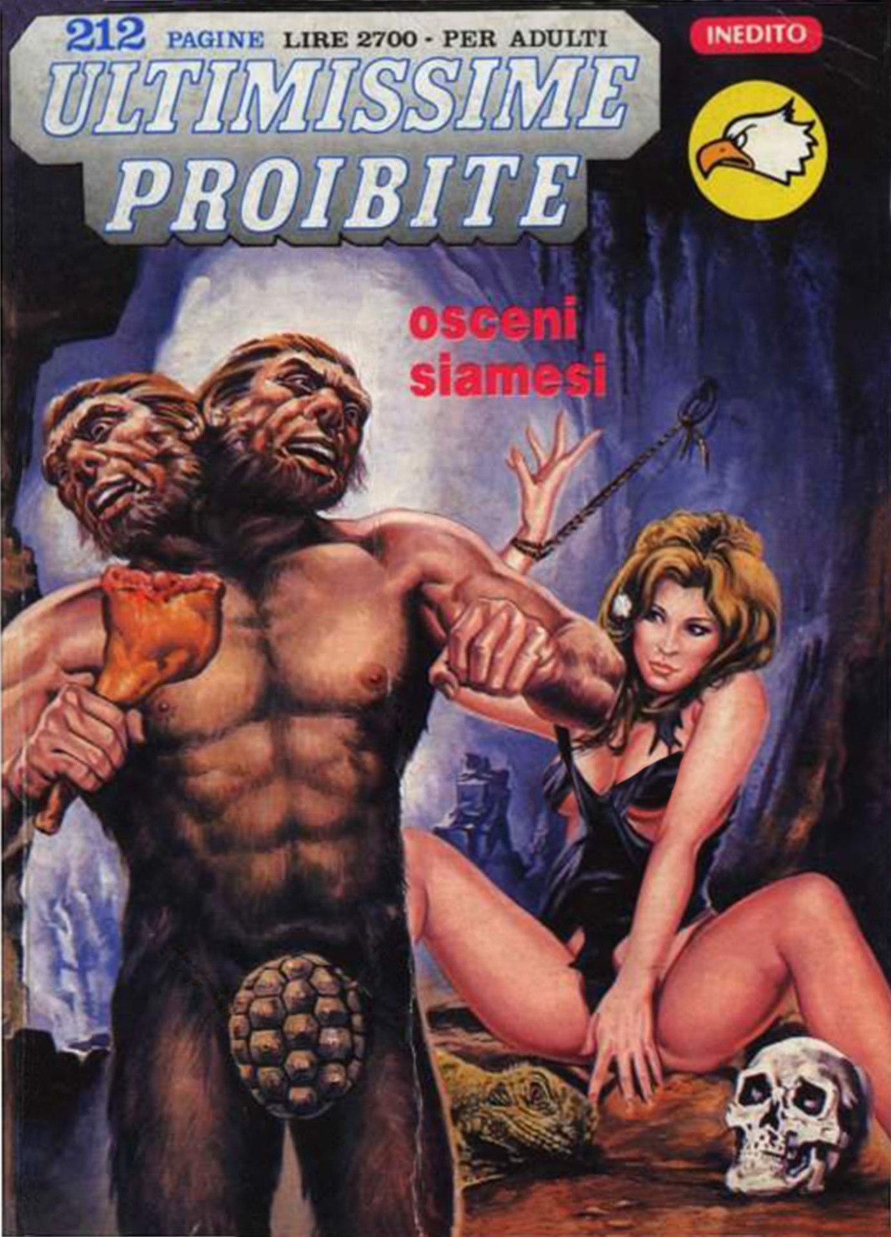 Original post here. Image contains the text “Ultimissime Prohibite. 212 pagine, lire 2700, per adulti, inedito. Osceni siamesi.” Original text: