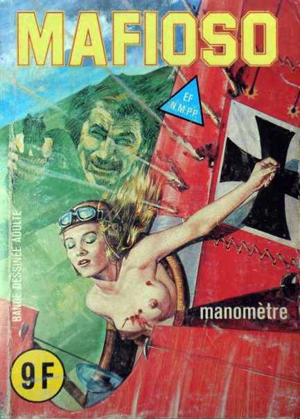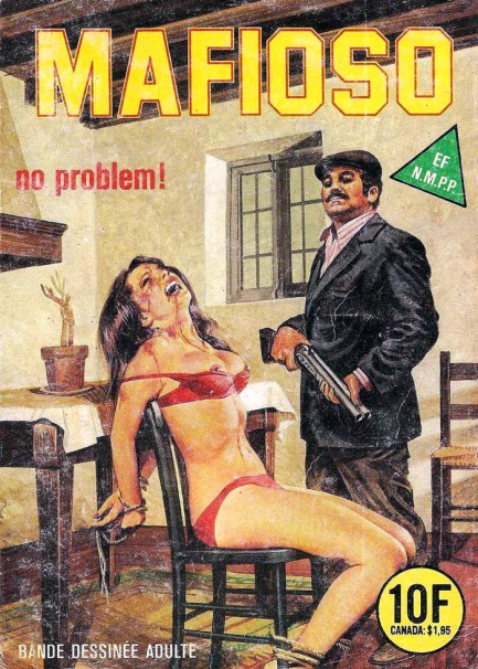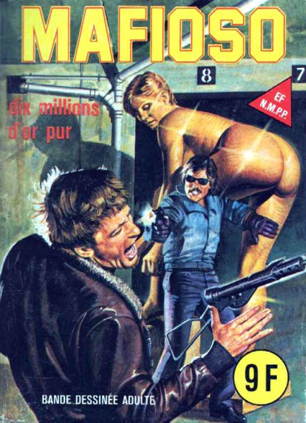 Original post here. Images are three covers of an Elvifrance bande dessinée adulte reprint of the Italian fumetto Mafioso, featuring stories labeled as “(1) Manomètre, (2) Six millions d’or pur, (3) No problem!” Sourced via eroticmacabre. Original text: