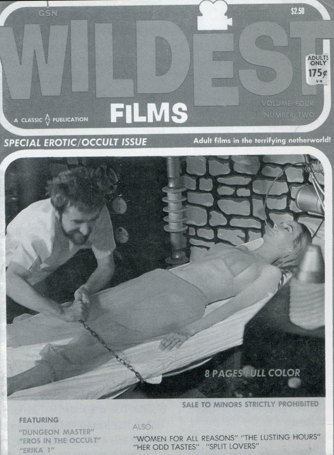 Original post here. Image is a magazine cover containing the following text “Wildest Films. Special Erotic/Occult Issue. Adult films in the terrifying netherworld. 8 pages in full color. Sale to minors strictly prohibited. Featuring ‘Dungeon Master,’ ‘Eros in the Occult,’ ‘Erika 1.’ Also: ‘Women for All Reasons,’ ‘The Lusting Hours,’ ‘Her Odd Tastes,’ ‘Split Lovers.'”