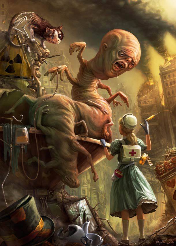 Original post here. Provenance was omitted in the tumblr reblog stream, but this is Alice in Nukeland by Aledin. Sourced on tumblr to http://smashdiggy.tumblr.com/post/92061997967″>smashdiggy via zbiorowisko.