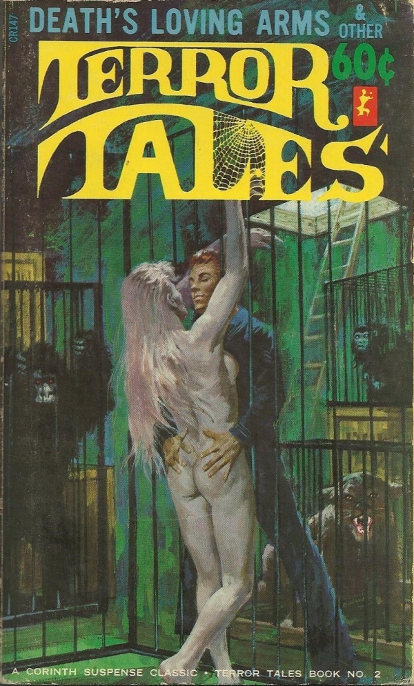 Original post here. Image is a paperback book cover containing the text “Death’s Loving Arms & other Terror Tales. 60¢. A Corinth Suspense classic. Terror Tales Book No. 2.” Sourced via notpulpcovers. Original text: