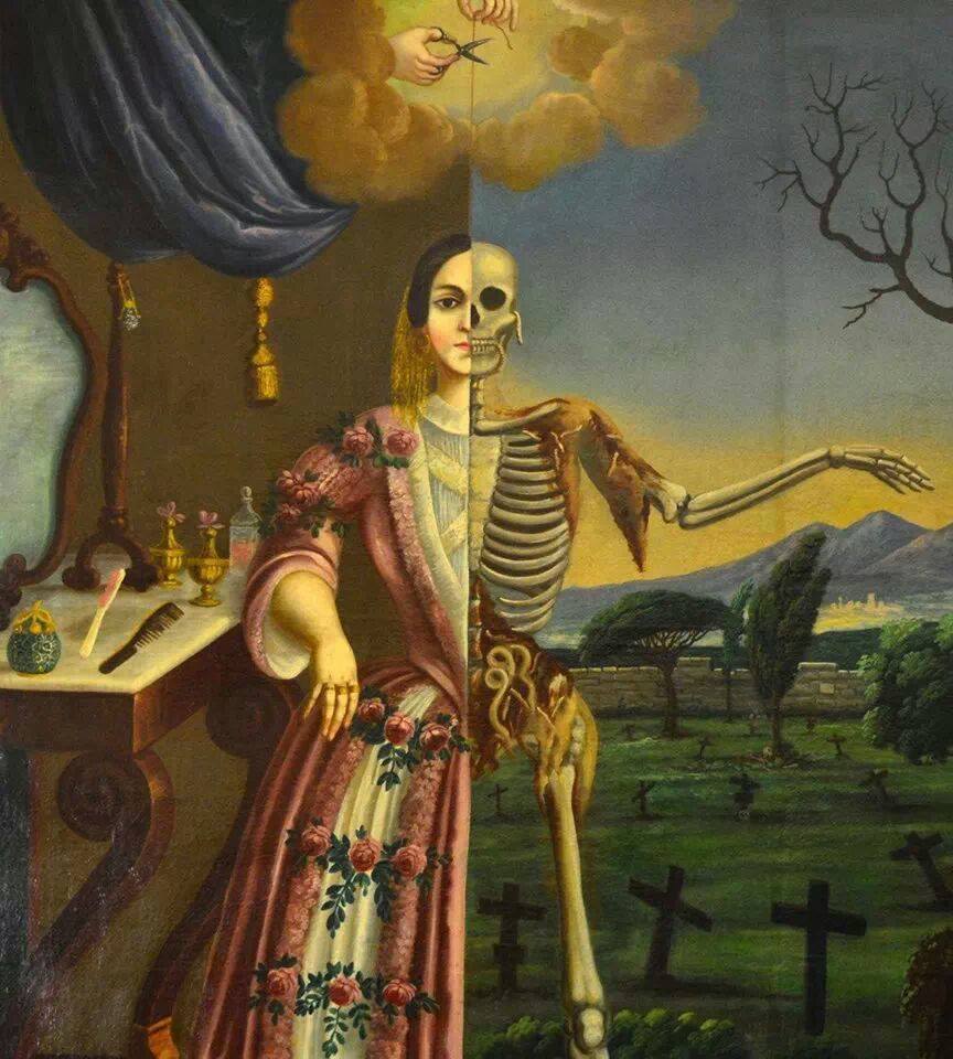 Original post here. The painting is Allegory of Death or The Mirror That Does Not Deceive by Tomás Mondragón. Sourced on tumblr to bleedingbetty1960.