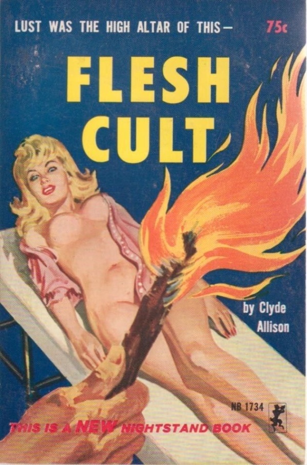 Original post here. Image is a paperback book cover containing the text “Lust was the high altar of this Flesh Cult, by Clyde Allison. This is a new Nightstand Book. NB 1734. 75¢.” Sourced via reginaldjuice. Original text: