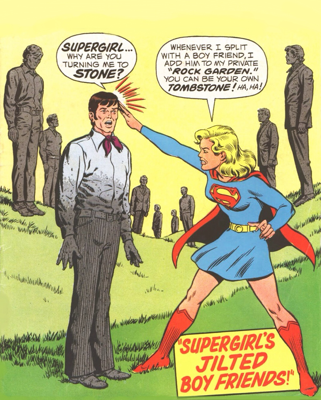 Original post here. Image is a comics panel containing the dialog balloons “(1) Supergirl…why are you turning me to stone? (2) Whenever I split with a boy friend, I add him to my private ‘rock garden.’ You can be your own tombstone. Ha ha!” and the caption “Supergirl’s jilted boy friends!” Sourced to boomstartkiller67 via ,a href=”http://the-bronx-remembers.tumblr.com/post/100909965459″>the-bronx-remembers.