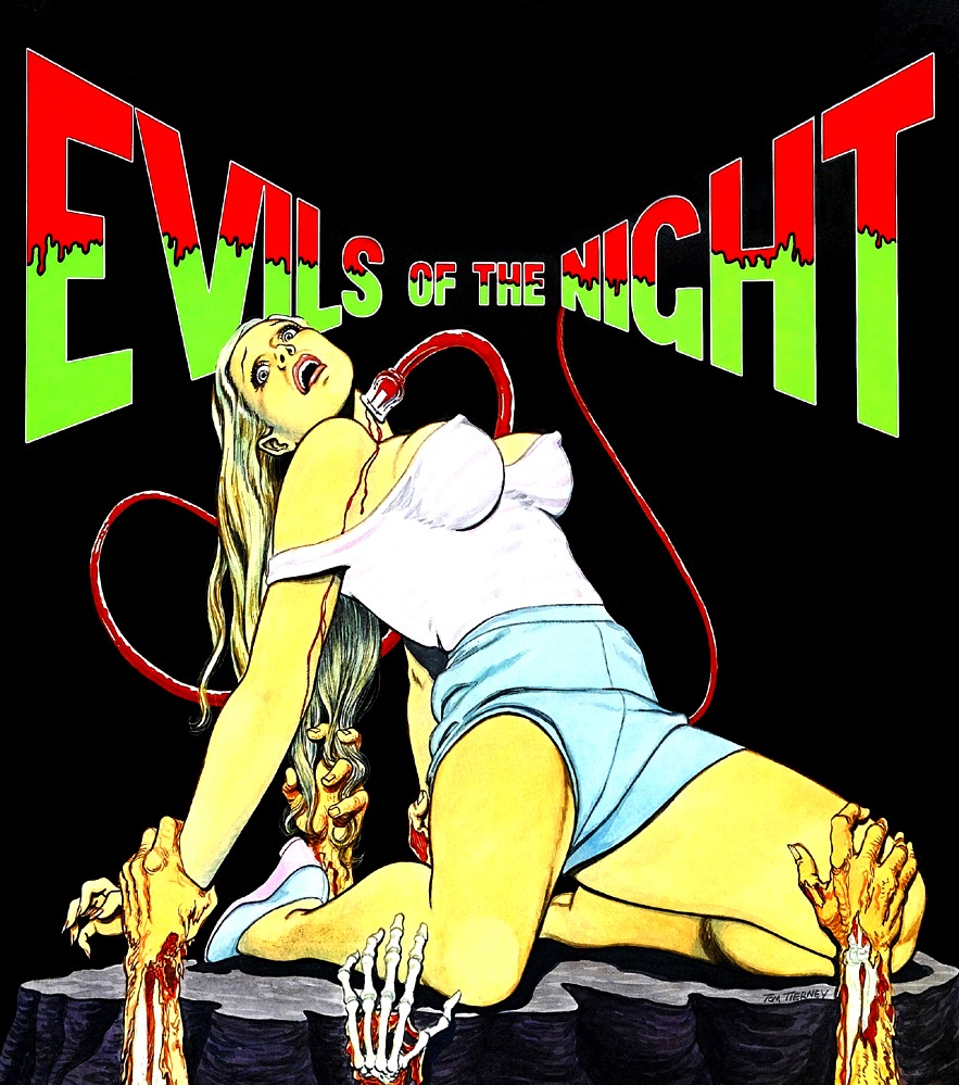 The image appears to be a crop of either a promotional poster of box cover-art for the 1985 movie Evils of the Night. The horror site Dread Central has a brief post on the movie and also provides more complete art: