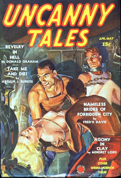 Original post here. Image is a cover of Uncanny Tales, containing the text “Revelry in Hell by Donald Graham. Take Me and Die! by Arthur J. Burkes. Nameles Brides of Forbidden City by Fred K. Davis. Agony in Clay by Mindret Lord. Plus other weird-horror tales.” Sourced via singoshibari. Original text: