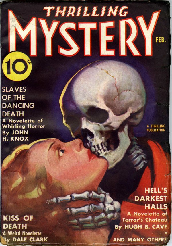 Original post here. Sourced to pulpcovers.com. Original text “Thirlling Mystery, February 1937. ‘The Kiss of Death.'” This pulp-cover image contains the text “Thrilling Mystery. Feb. 10¢. Slaves of the Dancing Death, a Novelette of Whirling Horror, by John H. Knox. Hell’s Darkest Halls, a Novelette of Terror’s Chateua, by Hugh B. Cave. Kiss of Death, a Weird Novelette by Dale Clark. And Many Others.”