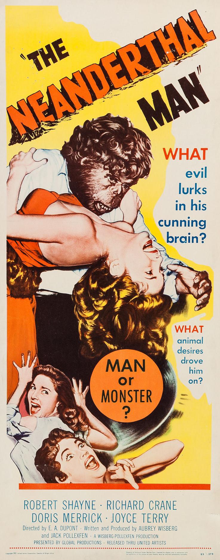 The Neanderthal Man Original post here. Sourced to spicyhorror. This is a promotional poster for the 1953 movie The Neanderthal Man.