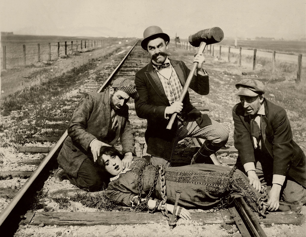 Barney Oldfield races a speeding locomotive to rescue a damsel in distress tied up on the tracks by evil villain Ford Sterling.