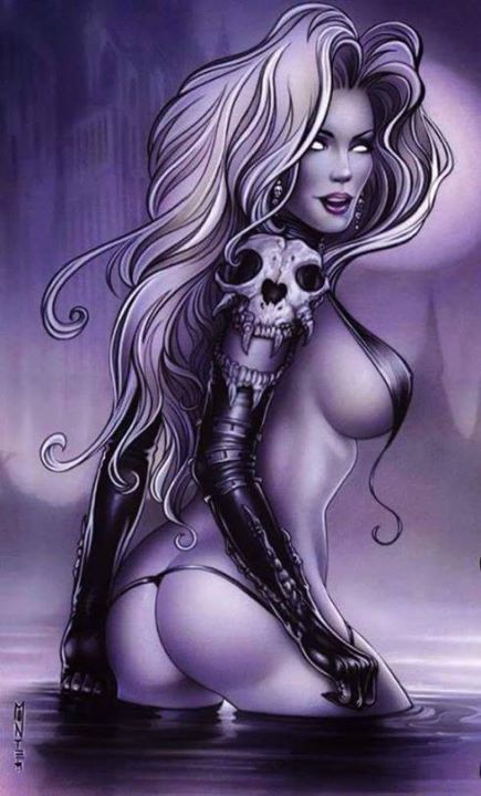 My original tumblr post was here. This appears to be a comics character named “Lady Death,” for which there is a site here. Here is the illustration in what I believe to be its original context:
