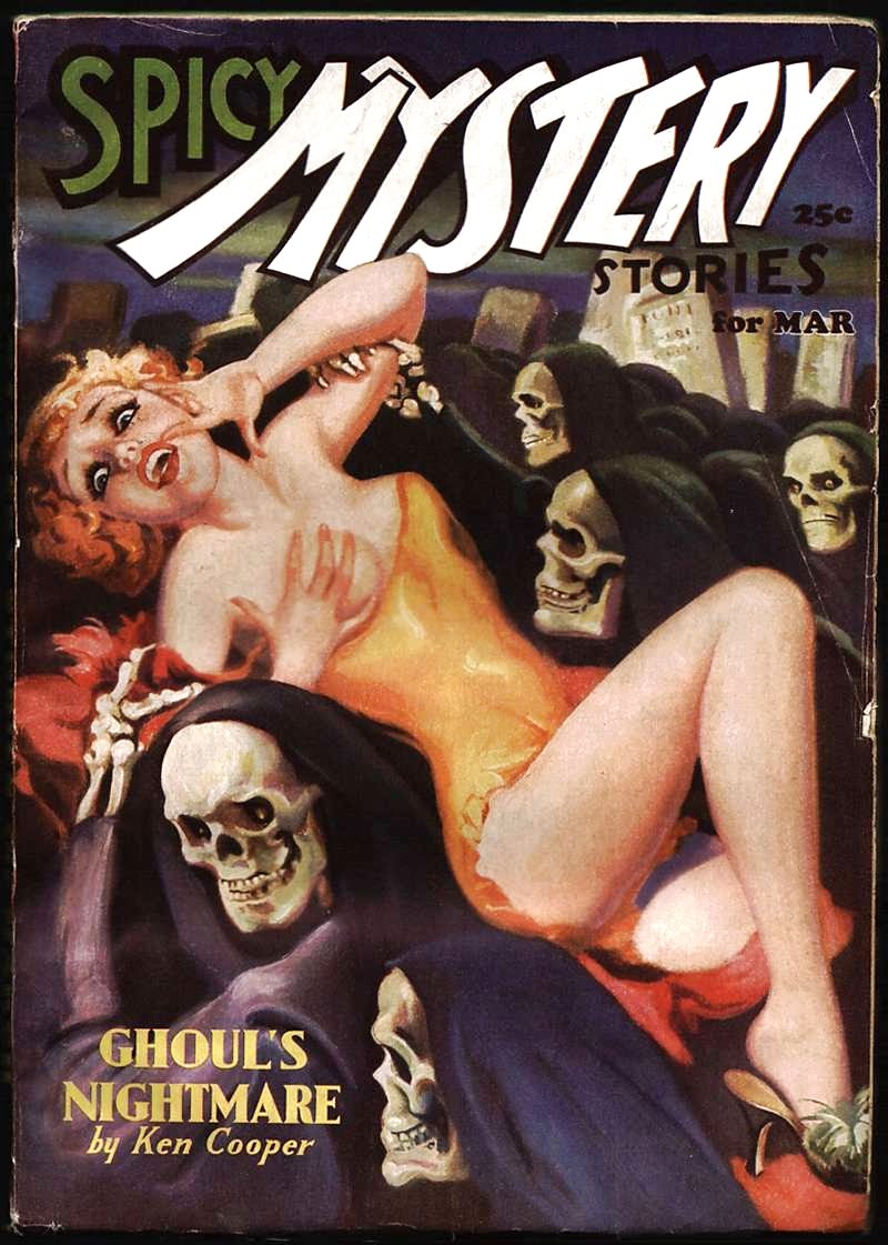 My original tumblr post was here.  Image is a cover of Spicy Mystery Stories (March 1936) promoting a story “Ghoul’s Nightmare” by Ken Cooper.   Original text: