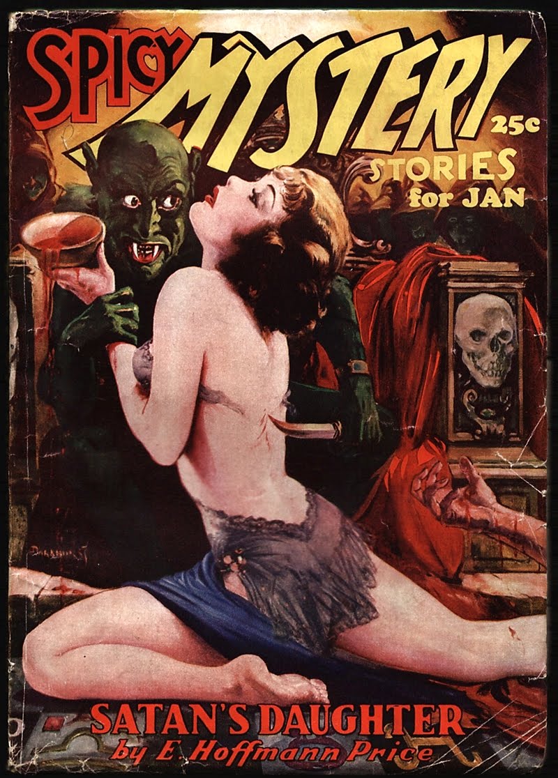 My original tumblr post was here. Image is a cover of Spicy Mystery Stories promoting a story “Satan’s Daughter” by E. Hoffman Price.  Original text: