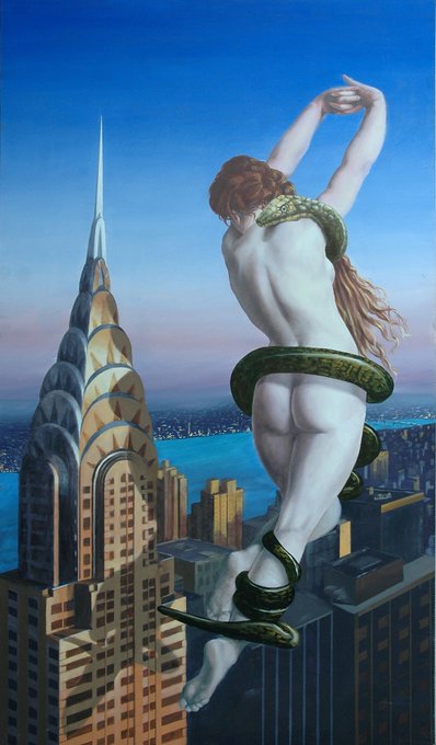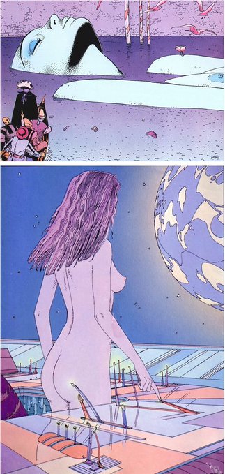 Three images of giant women by Moebius.