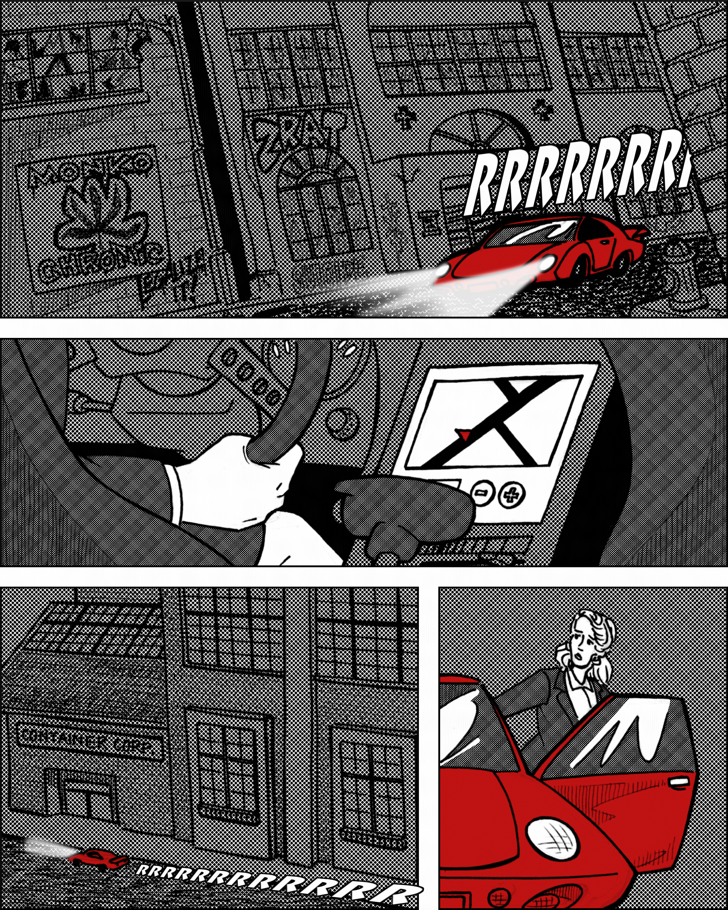 Panel 3: Laura’s sports car coming to to a stop in front of a loading dock of an old brick factory.