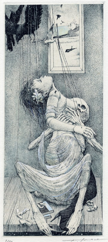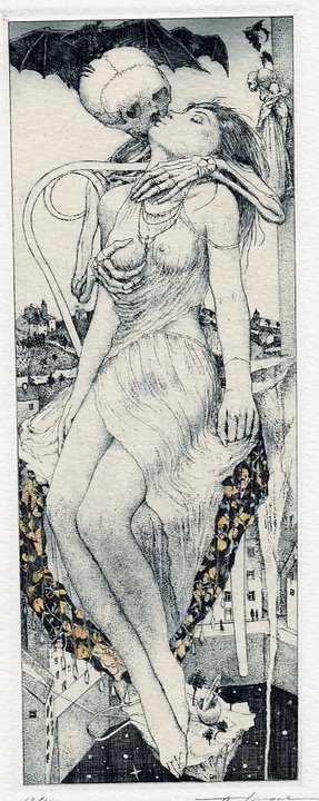 My original tumblr post was here. This appears to be an ex libris (a bookplate) by a little-known artist named Alphonse Inoue. There is a small article and gallery on him here. Original text: