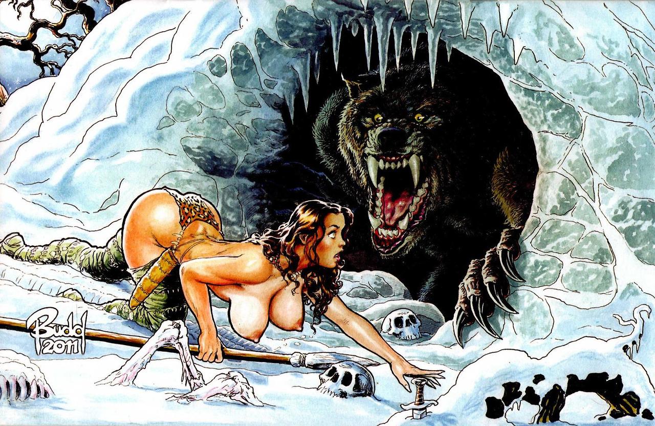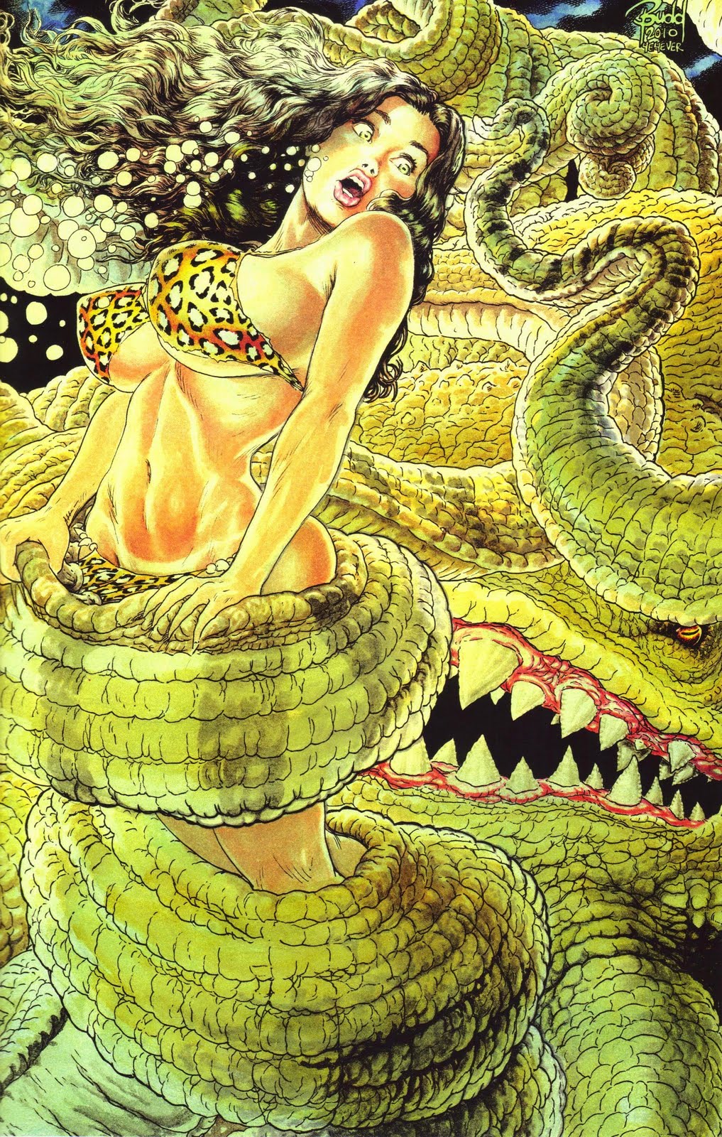 This artwork is by comic artist Budd Root (see confirming signature) who is best known for his independent comic Cavewoman. A non-nude version appeared in his Cavewoman: Prehistoric Pinups series, and a nude version (with different coloring) appeared on the cover of one alternate edition of Prehistoric Pinups #3. The version shown here is labeled in one place “Cavewoman Cover Colored by Neocene”, but no further information is available about that colorist.