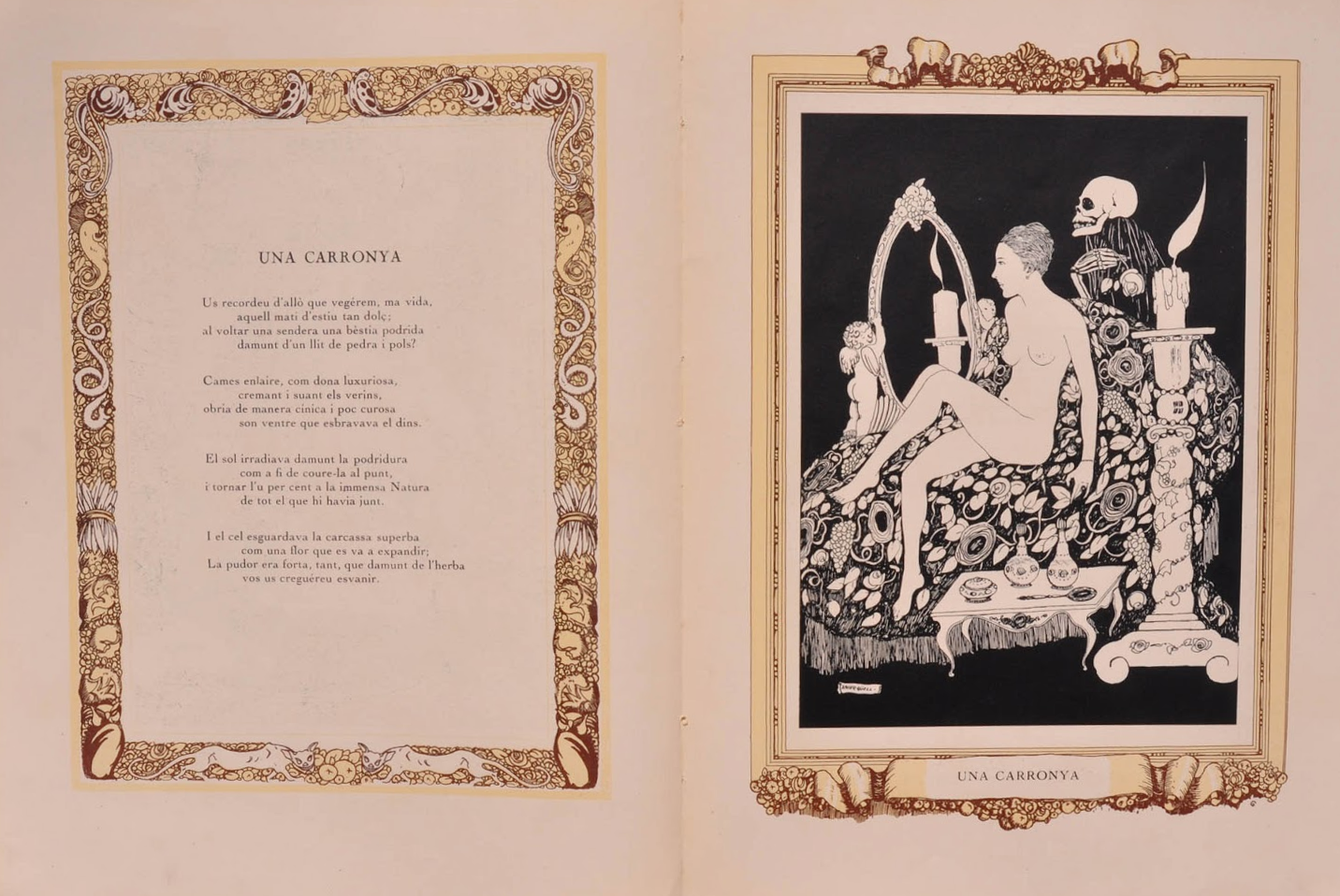 A slightly cleaned-up version of an image that appeared as a part of a set in this post at Galeria d’imatges X. The illustration is by Xavier Güell. The text is part of a translation of Charles Baudelaire’s Les Fleurs du mal into Catalan by Rossend Llates published at Barcelona in 1926 by Llibreria Catalònia. The displayed text reads