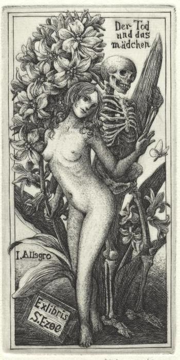 My original tumblr post was here. Image contains the text “Der Tod und das mädchen. I. Allegro. Ex libris S. Ezoe.” Original text: