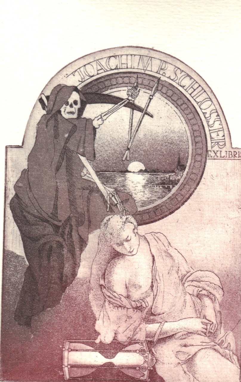 My original tumblr post was here. Image is a bookplate with the text “Ex Libris Joachim P. Schlosser.” Original text: