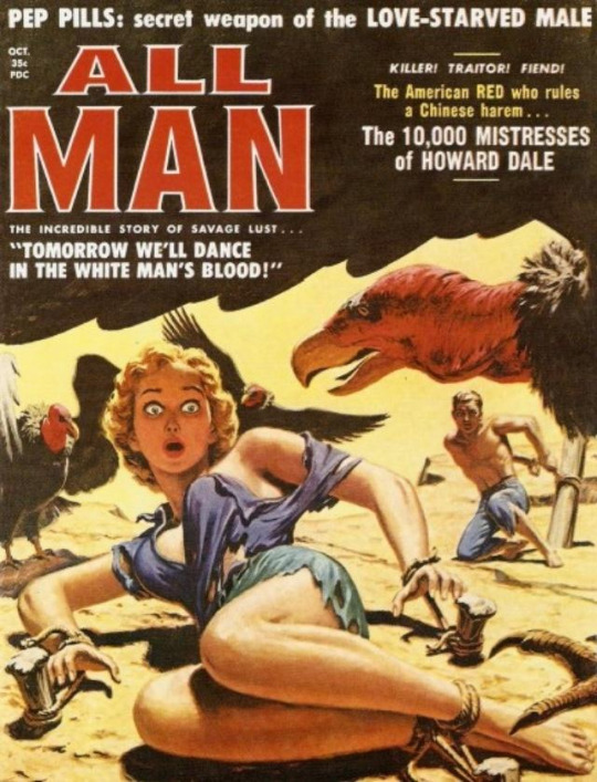 My original tumblr post was here. This illustration is a cover of Man’s Power (February 1963). It contains the text “No Rest from Passion — Confessions of a Nymphomaniac. One tick to Doom: The Bomb Squad in Action. Love Captive of Castro’s Execution Squad Harlots. Soft Maidens for the Monster’s Devil Fish. Brides of [?] in the Cave of Horror” Original text: