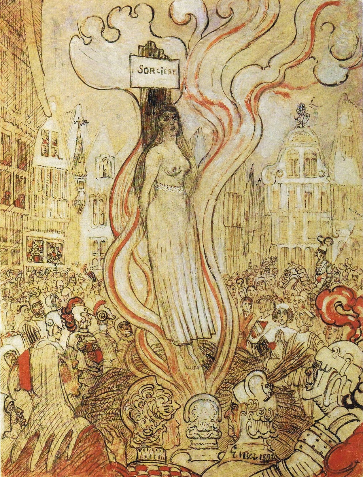 This artwork is by French expressionist and surrealist James Ensor. It is identified on this web page with the title “Le supplice de Jeanne d´Arc” (The Execution of Joan of Arc). It dates from 1892, according to the dated signature in the lower right.