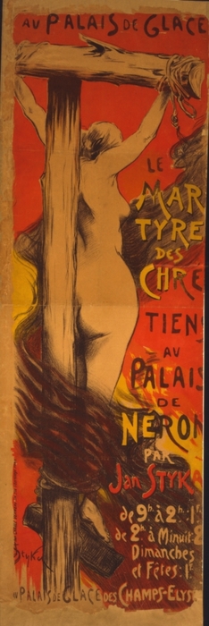 According to The Library of Congress, this artwork is the exhibition poster for Jan Styka’s panoramic painting “The Martyrdom of the Christians in Nero’s Circus” at the Palais de Glace des Champs-Elysee. The LOC offers this transcription of the text from the poster: “Le martyre des chrétiens au palais de Néro par Jan Styka au Palais de Glace des Champs-Elysée“. The advertised panorama was painted in 1897 or 1899 (sources differ) and (according to this Polish website) was lost in Russia during World War I. No images of it turned up in a cursory search.