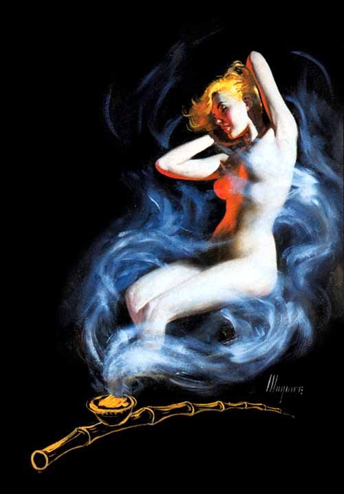 According to The American Art Archives, the title of this artwork is “Fantasy Blonde: Black Opium” and it was painted by famous book cover artist Robert Maguire in 1958. This blog post concurs. The art was for the cover of a book also called “Black Opium”.