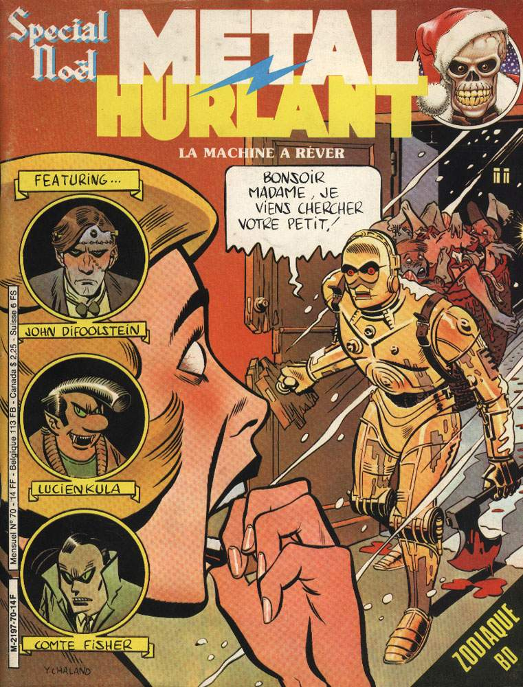 Original post here. Image contains the text “Metal Hurlant Special Noël: La machine a rêver. Featuring John Difoolstein, Lucienkula, Comte Fisher” and a comics word-balloon “Bonsoir Madame. Je viens chercher votre petit!” Sourced to lemondedeyan via here.