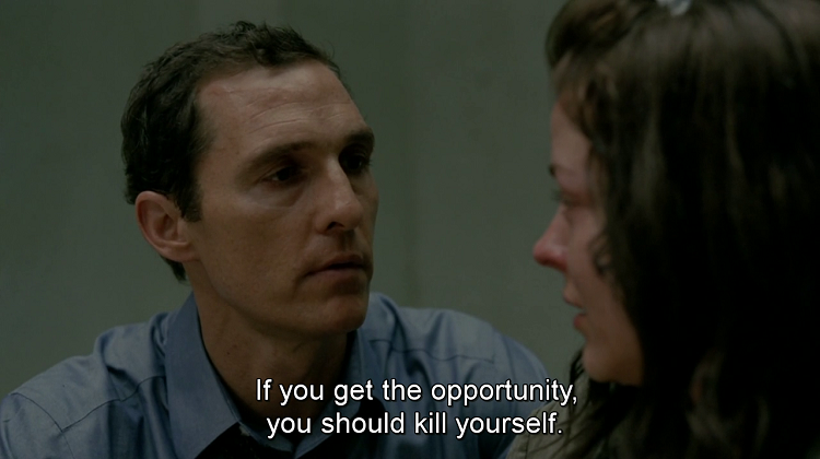 Original post here. The image is a screencap from the television series True Detective (Episode 6, “Haunted Houses,” first aired February 23, 2014) with the caption “If you get the opportunity, you should kill yourself.” Sourced to vital-dust via dollmeat7.