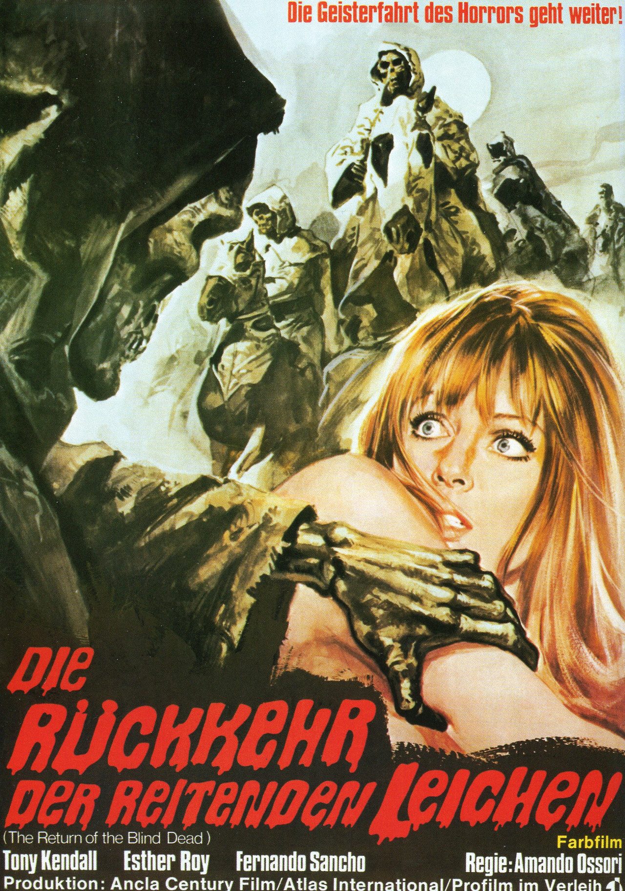 Original post here. Image contains the text “Die Geisterfahrt des Horrors geht weiter! Die Rückkehr des reitenden Leichen. (The Return of the Blind Dead. Tony Kendall, Esther Roy, Fernando Sancho. Produktion: Ancla Century Film/Atlas International/Profilm im Verleih.” Original text “German-language poster for El ataque de los muertos sin ojos, released in English as Return of the Evil Dead, alternately Return of the Blind Dead (1973).”