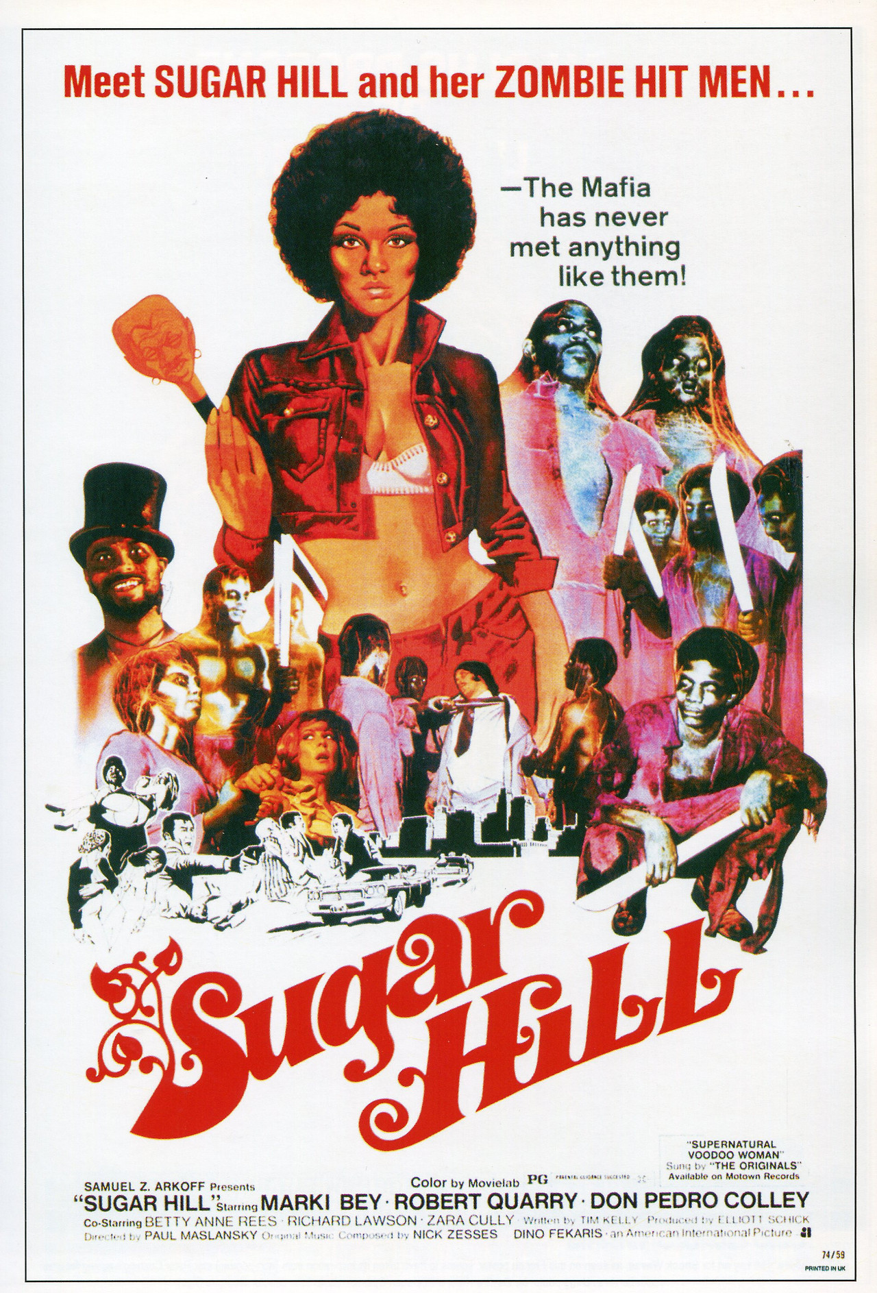 Original post here. Image is a movie promotional poster containing the text “Meet SUGAR HILL and her ZOMBIE HIT MEN — The Mafia has never met anything like them! Sugar Hill. Samuel Z. Arkoff presents ‘Sugar Hill’ starring Marki Bey, Robert Quarry, Don Pedro Colley. Co-starring Betty Anne Rees, Richard Lawson, Zara Cully. Written by Tim Kelly. Produced by Elliott Schick. Directed by Paul Maslansky. Original music composed by Nick Zesses. Dino Fakaris, an American International Picture. ‘Supernatural,’ ‘Voodoo Woman,’ sung by The Originals, available on Motown Records.” Original text: